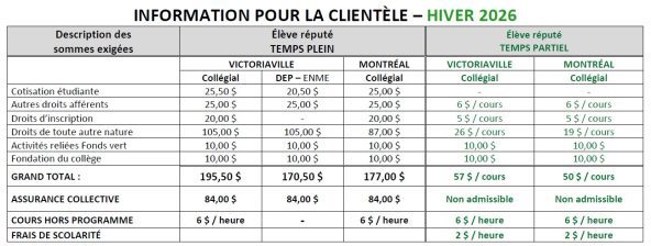 Guide étudiant Montréal Bienvenue à l’École nationale du meuble et de l’ébénisterie – campus de Montréal Tu trouveras ci-dessous une liste de thèmes soigneusement choisis pour t’aider à répondre à tes questions sur le fonctionnement de l’École et les ressources à ta disposition pendant tes études chez nous. Activités sportives Agenda Aide financière Aides pédagogiques individuels Association étudiante Assurance collective Banque alimentaire Bibliothèque Bourses externes Bureau d’admission Calendriers scolaires Carte étudiante Casiers Centre d’aide en français (sur rendez-vous) Changement d’adresse Cheminement dans le programme d’études Confirmation de fréquentation scolaire Désinscription/Abandon de cours Droits d’auteur Enseignement et encadrement Espace techno Frais d’administration pour services supplémentaires ou pénalités Frais d’inscription Heures d’ouverture Incomplet permanent Incomplet temporaire Intervention psychosociale Liste téléphonique des membres du personnel Livres et notes de cours Modifications d’horaire Objets perdus ou retrouvés Orientation et information scolaire Plan de l’ENME – Campus de Montréal Politique et procédure en matière de harcèlement et de violence Politique visant à prévenir et à combattre les violences à caractère sexuel Portail du Cégep – Omnivox Premiers secours et premiers soins avec liste des secouristes accrédités Projet éducatif Relevés d’impôt Remboursement (session et/ou Fondation) Renseignements personnels Résultats scolaires Ressources d’aide et numéros en cas de besoin Réussite des cours/poursuite des études en cas d’échec Révision de notes Sanction des études Sentinelles Service d’entraide à la réussite (SER) Service de la formation continue Service de placement Services adaptés Socioculturel Stationnement Transport en commun Agenda Si vous n’avez pas reçu votre agenda lors de la journée d’accueil, vous pouvez vous en procurer un dès le début des cours au local 103. Pascale Kutowski, agente de soutien administratif 514 528-8687, poste 2904 Retour au menu ⇑ Bibliothèque (local 104) Accès à distance Vous pouvez accéder au catalogue Koha et aux bases de données de partout dans l’école; Documentation Livres : documentaires et œuvres littéraires (romans, essais, nouvelles, etc.); Encyclopédies, dictionnaires, documents de référence; Documents vidéos; Présentoirs pour les nouveautés (livres). Locaux Aire générale pour le travail individuel et d’équipe; Postes informatiques dédiés à la consultation du catalogue Koha et des bases de données, pour les travaux de bureautique et l’utilisation d’Internet; Audiovidéothèque. Règlements de prêt Services Initiation à la bibliothèque; Aide aux usagers; Prêt; Prêt entre bibliothèques (Accès à la bibliothèque de l’Université de Montréal); Renouvellement à la bibliothèque, sauf si le document est réservé; Prêt des documents mis à la réserve par le personnel enseignant; Transit des documents entre la bibliothèque principale et les centres de documentation de l’École nationale du meuble et de l’ébénisterie; Référence; Réservation de documents; Accès à des bases de données et des sources numériques. Utilisez le catalogue Koha c’est la grande porte d’entrée pour chercher dans les collections de la bibliothèque. Vous y trouverez également la liste des nouveautés, l’horaire des centres documentaires et les liens directs vers les bases de données, les sources de référence ainsi que vers d’autres catalogues. Entrez dans votre compte personnel Koha avec votre numéro de DA comme numéro de compte et votre date de naissance (JJMMAA ou AAAAMMJJ) comme mot de passe. En accédant à votre compte personnel, vous pouvez faire toutes les recherches désirées, mais vous aurez en plus la possibilité de les conserver dans des listes privées. Vous pourrez aussi réserver des documents, renouveler vos prêts à distance, vérifier votre dossier de prêt et savoir si vous avez des amendes à payer, revoir l’historique de vos recherches. Retour au menu ⇑ Le bureau d’admission peut répondre aux besoins suivants : Admission; Inscription; Paiement des frais; Casiers; Dossier scolaire : relevé de notes, diplôme, copie de document officiel ou tout autre document Omnivox; Formulaire à remplir pour : une attestation de fréquentation scolaire; une demande de remboursement à la suite d’une désinscription dans les délais; une demande de révision de notes. Toute autre demande d’information, au besoin. Pour information : Élèves au régulier Pascale Kutowski, agente de soutien administratif Local 103 Tél. : 514 528-8687, poste 2904 enme.mtl@cegepvicto.ca Élèves au Service de la formation continue Tanya Richard, agente de soutien administratif Local 108 Tél. : 514 528-8687, poste 2901 sfcmtl@cegepvicto.ca Retour au menu ⇑ Centre d’aide en français (sur rendez-vous) Le Centre d’aide en français (CAF) de l’École nationale du meuble et de l’ébénisterie offre plusieurs formules d’aide qui visent à soutenir les élèves dans leurs efforts pour maîtriser le français écrit, réussir leurs cours de français réguliers et se préparer à l’épreuve uniforme. Pour information : à venir Retour au menu ⇑ Changement d’adresse L’élève peut, en tout temps, effectuer son changement d’adresse sur Omnivox, module Dossier personnel. Retour au menu ⇑ Cheminement dans le programme d’études L’élève est responsable de son cheminement dans le programme qu’il a choisi. L’élève peut consulter sa grille de cheminement sur le portail OMNIVOX, module grille de cheminement. Retour au menu ⇑ Confirmation de fréquentation scolaire L’élève doit obligatoirement confirmer sa présence à ses cours sur Omnivox, module Fréquentation scolaire, aux dates suivantes : à venir pour la session d’automne à venir po