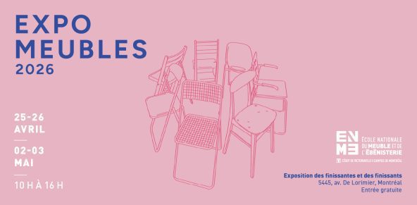Tous les Évènements Expo Meubles – Montréal 25 avril 2026 - 10 h au 3 mai 2026 - 16 h « Portes ouvertes à Victoriaville Détails Début : 25 Avr 2026 - 10 h Fin : 3 Mai 2026 - 16 h Lieu École nationale du meuble et de l’ébénisterie – Campus de Montréal 5445, rue De Lorimier Montréal, Québec H2H 2S5 Canada + Google Map Téléphone : 514 528-8687 Les finissantes et finissants de l’École nationale du meuble et de l’ébénisterie (ENME), campus de Montréal, sont fiers de présenter leur projet synthèse lors de l’Expo Meubles, qui se tiendra dans la magnifique salle d’exposition de l’École les 25-26 avril et 2-3 mai 2026. Entrée libre. + Google Agenda+ Ajouter à iCalendar